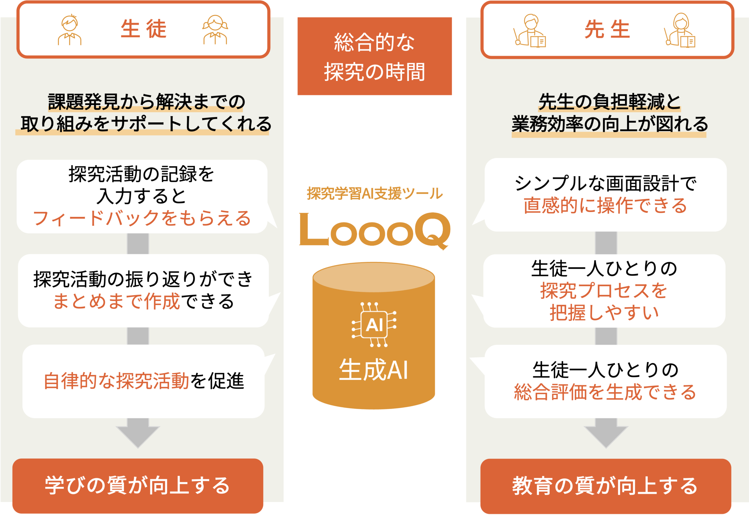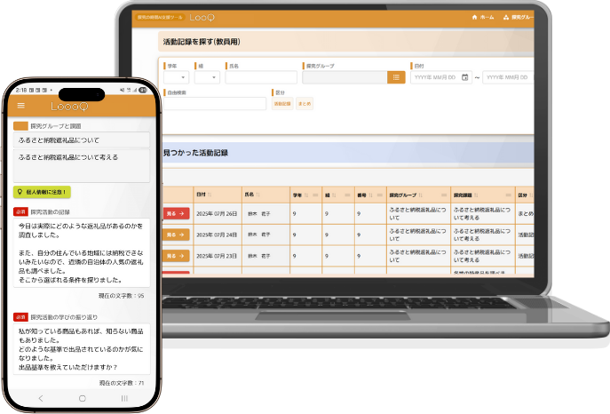 LoooQは、そんな先生方の校務負担の軽減や業務の効率化を実現するとともに、生徒一人ひとりの自律的な探究活動を促進し、教育の充実を一層図ることを目的とした製品です。
